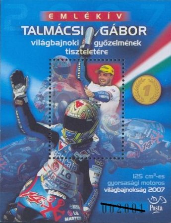 Az emlékíven belüli képen Talmácsi Gábor portréja látható. Az emlékív a motorversenyek hangulatát idéző, dinamikus jelenetet ábrázol. Az emlékíven fent az "Emlékív - Talmácsi Gábor világbajnoki győzelmének tiszteletére" felirat olvasható. Jobb oldalon az aranyéremre utaló grafikai megfogalmazásban egy babérkoszorúba foglalt "1-es" szám, alatta Talmácsi Gábor nyomtatott aláírása és lent a "125 cm3-es gyorsasági motoros világbajnokság 2007" felirat, a sorszámozás és a Posta logója található.