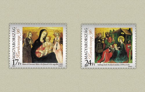 A 17,- Ft -os bélyegen Matteo di Giovanni (1430-1495) "Mária a kis Jézussal és a két angyallal" (1482), a 24,- Ft -os bélyegen Ismeretlen festő - "Királyok imádása" (1450 körül) látható.
