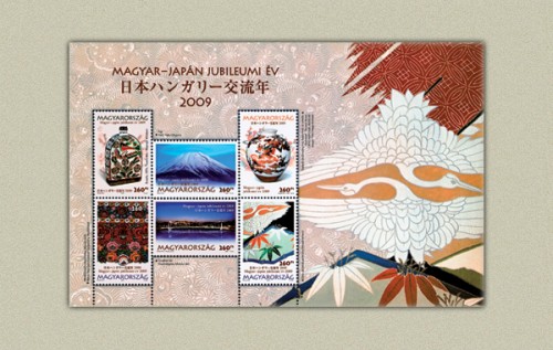 In the Hungarian miniature sheet containing six stamps appearing for the occasion of the Hungarian-Japanese jubilee year, the stamps are laid out in the shape of a perforated letter H. The stamp designs show a few of the national values of the two countries. The Hungarian designs are a flask from the Museum of Ethnography (Budapest), Matyo folk embroidery (Matyo Applied Art Folk Collection, Mezőkövesd) and the floodlit Elizabeth Bridge (based on a photo by József Hajdú and designed by Motoko Ishii).