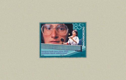 The thumbnail forefront Sasváriné Paulik Helena adogatás Paralympic table tennis champion when shown. The background details of the portrait appears in a magnified scale. The main motive for the occasional wheelchair envelope, the occasional stamp borítékrajz motifs appear in the graphics.