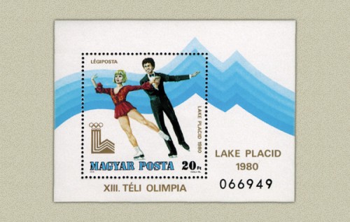 Lake Placidban megrendezett Téli Olimpia alkalmából megjelent blokkon Jégtáncospár látható.