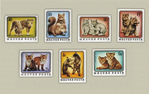 Vadállatkölykök bélyegsor 0.40 Ft -os bélyegén Vaddisznó, a 0.60 Ft -os bélyegen Mókus, a 0.80 Ft -os bélyegen Húz, az 1.20 Ft -os bélyegen Farkas, a 2,- Ft -os bélyegen Róka, a 4,- Ft -os bélyegen Barnamedve, a 6,- Ft -os bélyegen Oroszlán látható.