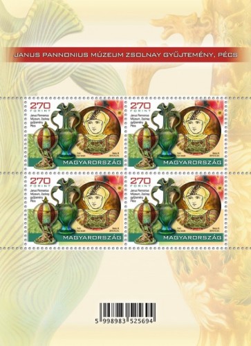 Magyar Posta is presenting the collections of Hungarian museums on special stamps. On the denominations issued in the series in 2015, some of the highly prized treasures of the Rómer Flóris Museum of Art and History in Győr and the Zsolnay Collection of the Janus Pannonius Museum in Pécs are featured. The new issues are in the format of a miniature sheet of four stamps. The new miniature sheets were designed by the graphic artist Barnabás Baticz using photographs by Csaba Taca Tanai and István Fűzi and produced by the banknote printing company Pénzjegynyomda Zrt.